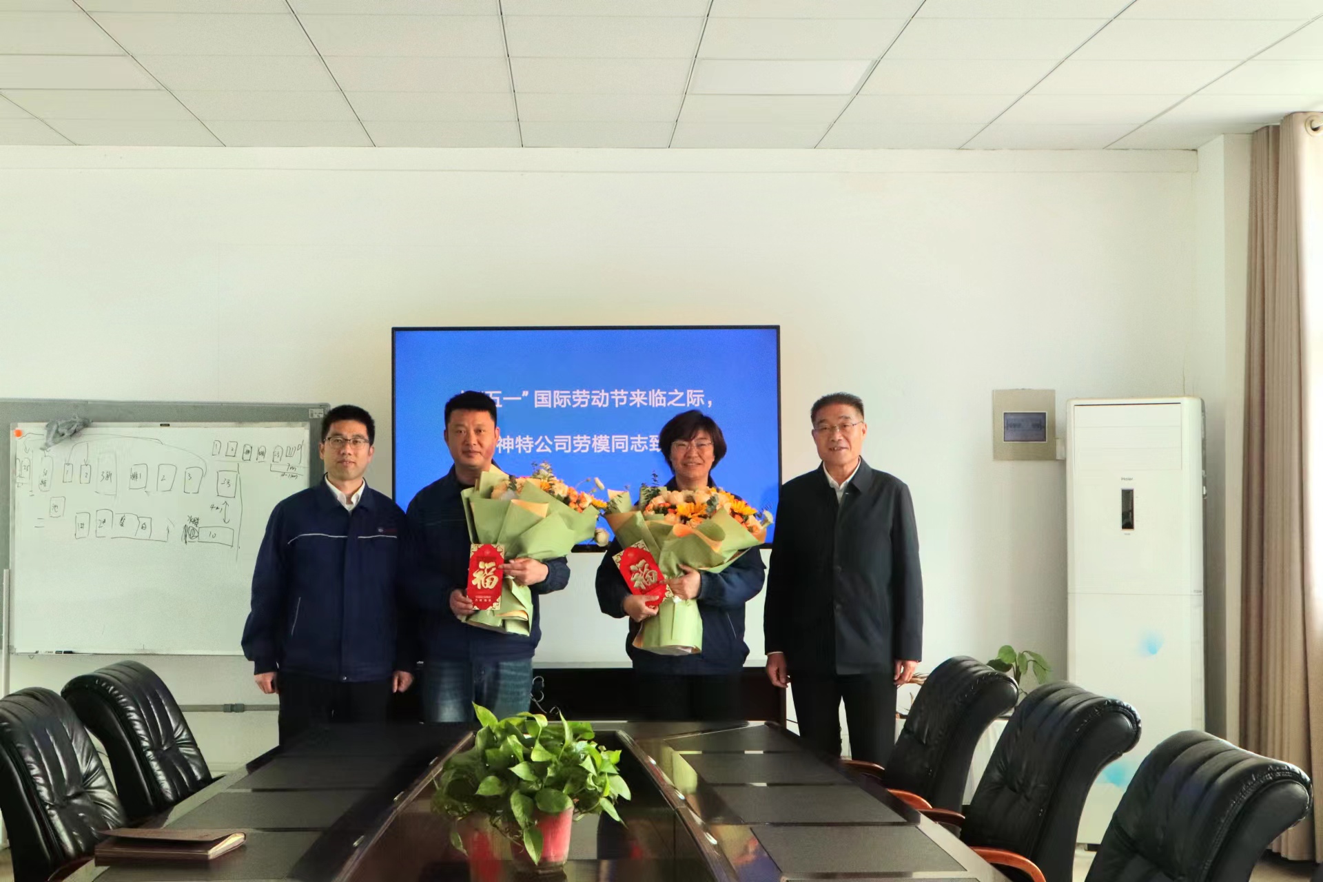 劉總與兩名市勞模面對面交流,傾聽他們的心聲和意見,感謝他們長期以來為企業(yè)發(fā)展作出的貢獻,并獻上一束鮮花、送上一份慰問、表達一段祝福。